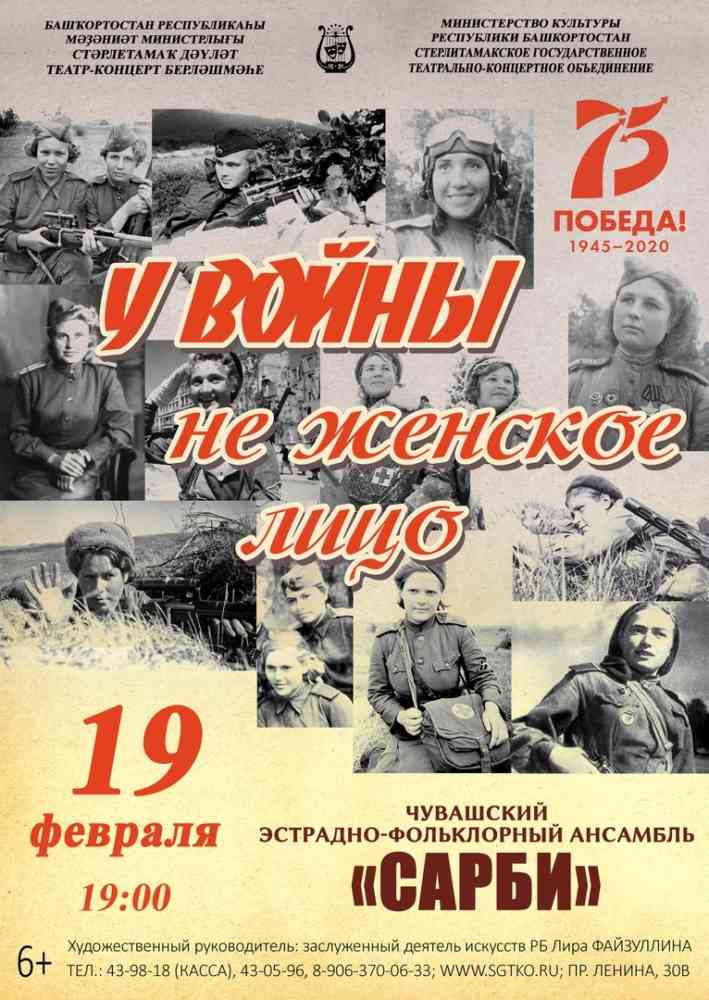 Стерлитамакское государственное театрально-концертное объединение приглашает школьников и их родителей посетить программу эстрадно-фольклорного ансамбля «Сарби» под названием «У войны не женское лицо!».