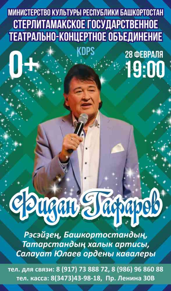 Народный артист России , Башкортостана и Татарстана , кавалер ордена Салавата Юлаева , исполнитель хита «Зимний романс» («Ҡышҡы романс» (башк.), ЛЕГЕНДА башкирской эстрады и просто человек широкой души – Фидан Гафаров приглашает своих поклонников на концерт, который состоится в Стерлитамакском государственном театрально-концертном объединении.